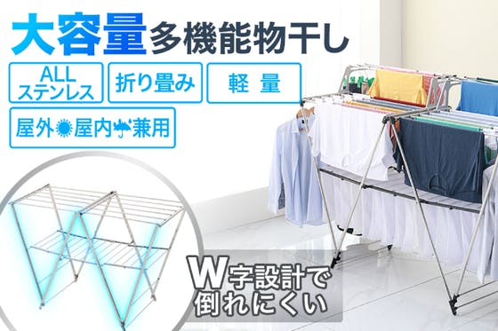 W字設計で大量に洗濯物を干しても安定感抜群。Yシャツ、ズボン、お布団まで全て干せちゃいます。屋内外両用・コンパクトに収納できる折りたたみ式。ファミリー向けと一人...