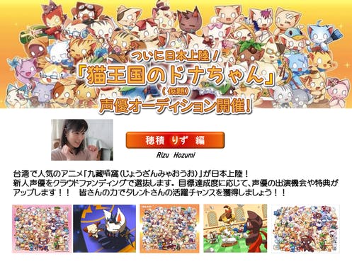 台湾で人気のアニメ「九藏喵窩(じょうざんみゃおうお)」が日本上陸!アニメ&番組に出演する声優をクラウドファンディングで選抜します。皆さんの手で、穂積りずの活躍を...