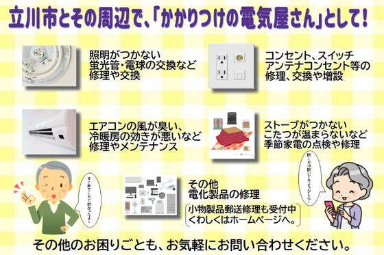 DEN-Q 電救社は、東京都立川市 およびその近隣にお住いの皆様の電気のお困りごとを、 できる限り迅速に解決していくように承っております。 電化製品の修理・...