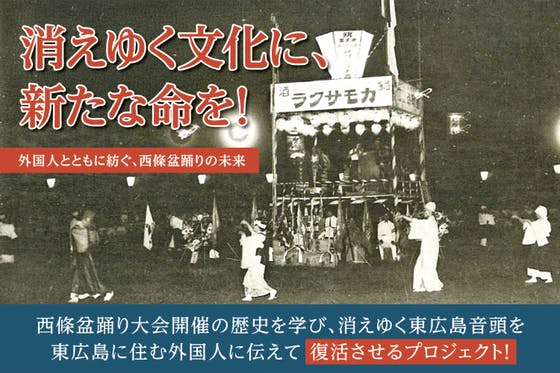 かつて10万人が踊った西条盆踊り。今、忘れられつつある東広島音頭を、外国人60名と浴衣で蘇らせます。伝統と多文化が響き合う夏に、あなたの力を貸してください。