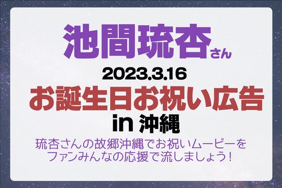 池間琉杏さんのお誕生日お祝いムービーを出身地沖縄の街頭ビジョンで放映します! ファンの方や、まだ琉杏さんを知らない人にもみてもらえる場所に流したいと思っています。