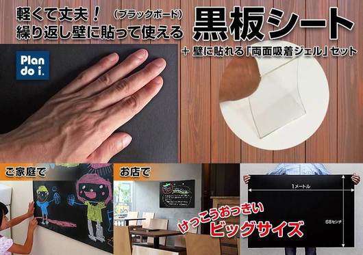 軽くて丈夫な「黒板シート」は、チョークやブラックボードマーカー等、色々なもので描ける便利なシートです。壁に貼るときは、今回のセット企画品「両面吸着ジェル」を使っ...