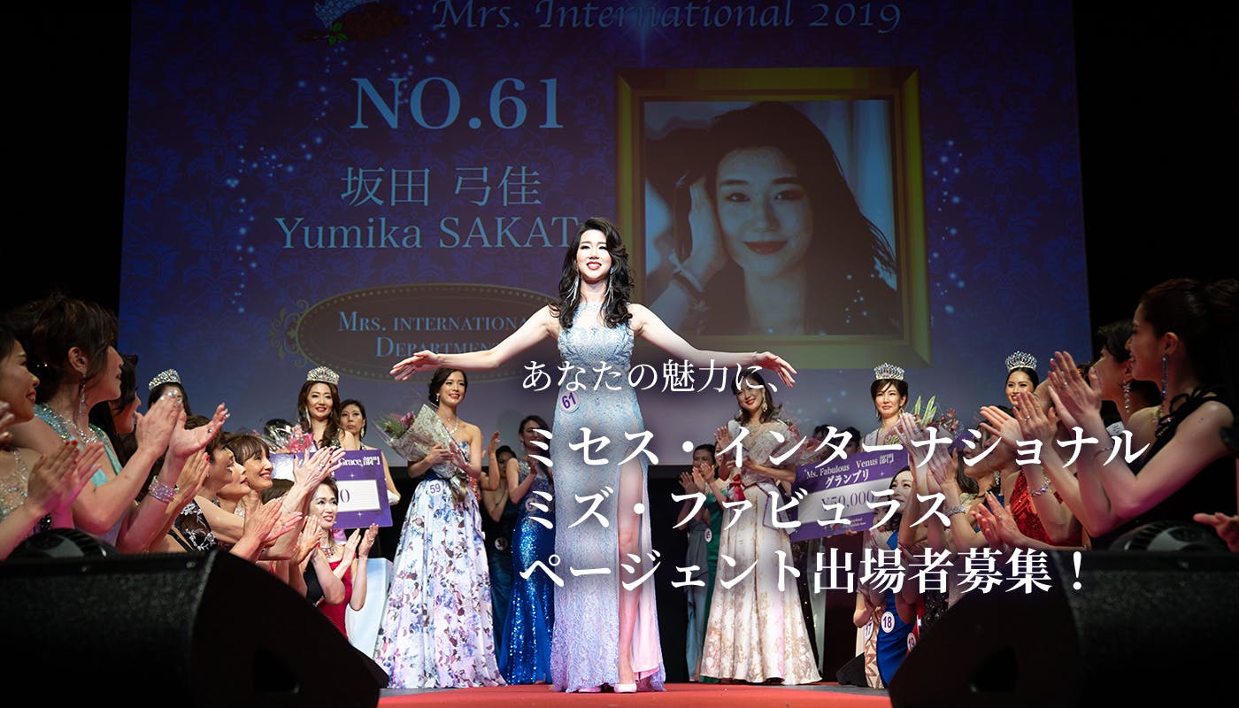 私たち『ミセス・インターナショナル・ジャパン』は、一般社団法人国際女性支援協会(通称:ローズクルセーダーズ)が日本に創設した、既婚女性(ミセス)のためのビューティー・コンテストを運営している団体です。『ミセス・インターナショナル』は、アメリカのウェストヴァージニア州に本部を置き、40年の歴史を持つ、ミセスを対象とした世界規模のビューティ・コンテスト・ブランドです。「ミセス・インターナショナル日本大会」では、毎年全国の大勢の応募者の中から約70名のファイナリストが美しさを競い合い、日本代表(グランプリ)とパンパシフィック代表が選ばれます。アメリカで行われる世界大会では、日本代表を含む世界各国・地域を代表するグランプリが、世界一を目指してその美しさを競います。 『ミズ・ファビュラス』は、全ての女性に広くコンテストの機会を提供しようと日本独自で同時に開催している、年齢別に20代以上の未婚・既婚女性とシングルマザーが参加できるコンテストです。  私たちの活動は、ただ単に外見の美を競うのではなく、知性や日頃の社会貢献など、内面の美も問われることが特長です。それぞれの家庭の中で妻として母として役割を果たしながらも、自身を磨き続け、それぞれの行っている社会貢献について発信したり、より自己を高めるためのチャレンジの場としてコンテストに挑みます。私たちはそのような機会や活躍の場を提供し続けることで、生き生きと内面から輝やく日本の女性が世に多く輩出される、そんなお手伝いを日々続けています。年齢にとらわれず、今からでも何か新しいことにチャレンジしてみたい方、美や教養を磨いてみたい方、ドレス姿でランウェイを歩いてみたい方、社会貢献活動を通じてご自身の才能を社会に活かしてみたい方、そしてそんな女性を応援してみたい方は、是非この続きをご覧いただき、一度ぜひ、私たちの公式HPを覗いてみてください!