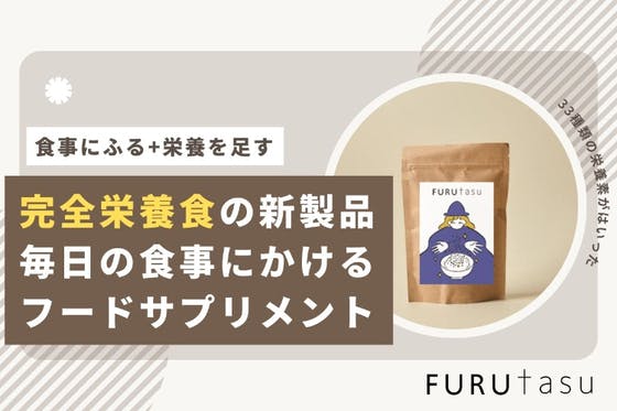 完全栄養食を毎日手軽に美味しく取り入れられる、厚生労働省が定めた一日に必要な栄養素33種類がすべて入ったフードサプリメント【FURUTASU】をお届けいたします。