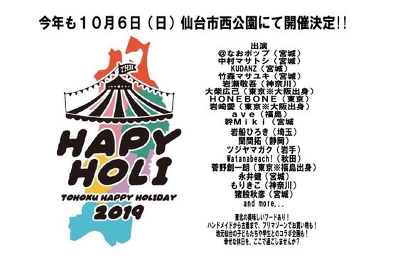 10月6日(日)仙台市西公園にて開催させていただく無料野外フェス「東北HAPPY HOLIDAY2019」今年も東北はもちろん全国各地から凄腕アーティストが集結...