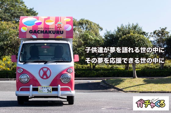 移動販売型ガチャガチャ=ガチャくる号では、普通のおもちゃのガチャガチャ、食品ロス解決のおやつガチャを行っています。そして新たに、子供たちの夢を応援するガチャガチ...