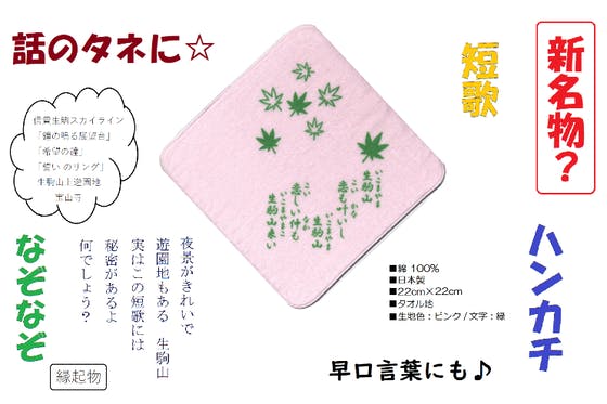 おみやげ、プレゼントに最適なハンカチです。奈良生駒の新名物、おみやげの定番になる事を目指して頑張っています!和歌や百人一首が好きな人、生駒にゆかりのある人、ハン...