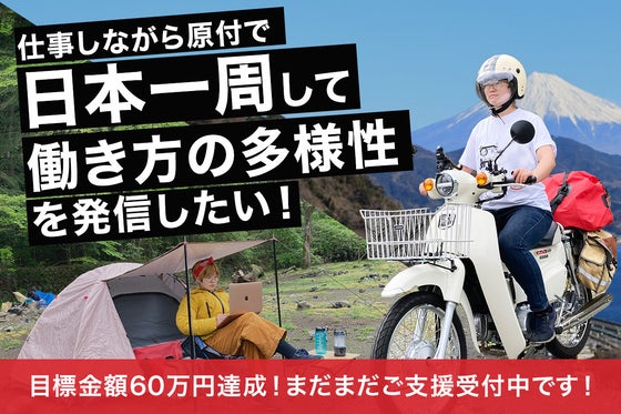 フリーランスデザイナーとして、原付バイク「スーパーカブ」で日本一周して、多くの方に理想の生き方や働き方を追い求める勇気を与えたいです!クラウドファンディングを通...