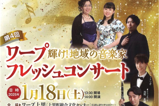 今後の活躍が期待される地域の音楽家によるコンサートを令和7年1月に開催します。このコンサートを通じて地域の音楽家を応援すると共に多くの感動を与えて生活の活力にし...