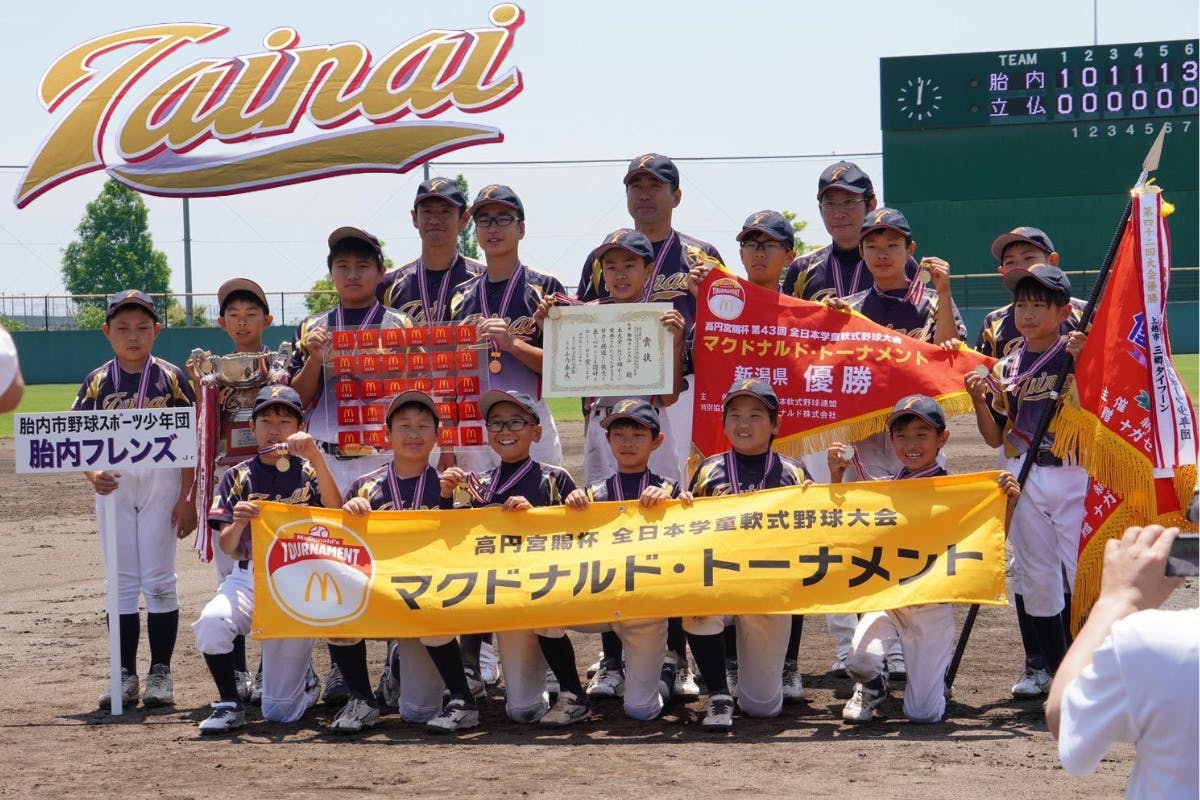 はじめまして!新潟県胎内(たいない)市の小学生野球チーム「胎内フレンズJr(ジュニア)」です。胎内市内4つの小学校の児童で構成されるチームです。 雪国新潟県の田舎町ですので、雪が積もる時期は体育館で、夏の暑い時期は外でめいいっぱい練習を頑張っています。平日火・木曜日の放課後、土日や祝日には練習試合も組み込みながら、練習を重ねています。 家での自主練習も手を抜かない、ひたむきに頑張るこどもたちです。この度、その練習の成果が実を結び、初めて全国大会に出場できることになりました。