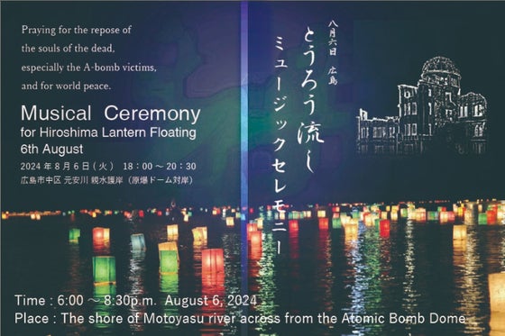 8月6日、広島「原爆の日」の夜、原爆ドーム前の元安川で行われる「とうろう流し」に合わせて音楽演奏を奉献することで、原爆死没者供養と平和への祈りとします。
