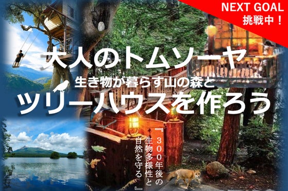 【達成!&ネクストゴール中】自然豊かな森の中で、本質的な生きる力を取り戻せる場所、心と体を刺激する基地ツリーハウスを作りたい。今を生きる私達大人が豊かな未来を想...