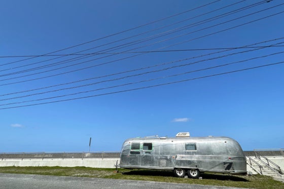沖縄県大宜味村に突如現れたエアストリームカフェ。 大宜味村の石灰岩の山、目の前には東シナ海そして美しい夕日 流線形のアルミニウム製のボディー、31ftの圧倒的存在感。
