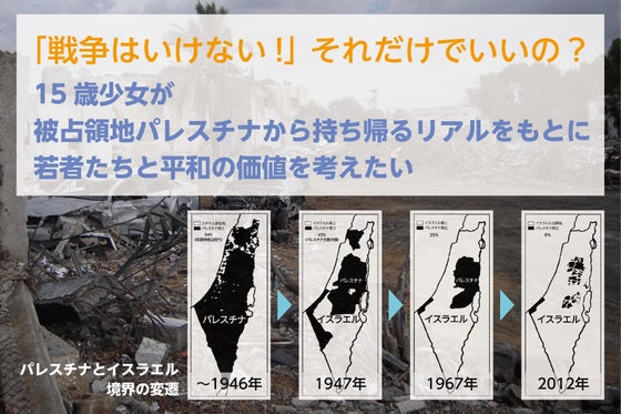 世界に緊張が高まる中、未来の日本の舵取りを担う若者世代が戦争の現実や平和の価値を考え、平和を勝取る方法を模索する平和教育を始めたい。そのため今も占領が続くパレス...