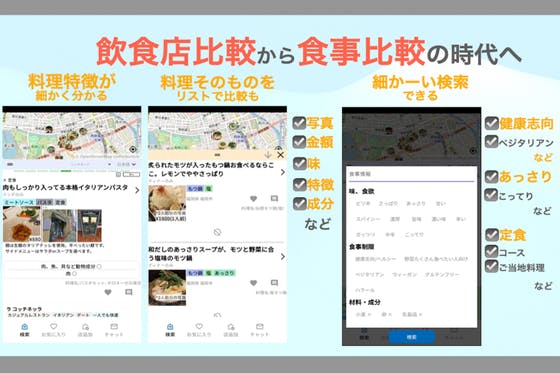 食事自体を比較して飲食店を探せるアプリ「日本メニュー表」で、コース料理や食べ放題や定食、それから「ベジタリアン」や「ヴィーガン」「ご当地料理」を食べたい人が「パ...