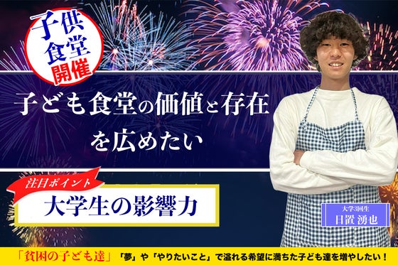 貧困問題によって「夢」や「やりたいこと」を諦めざるおえない子ども達が増えている現状。そういった子供達の居場所である「子ども食堂」の存在や価値を多くの人に広め、貧...