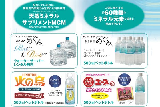 サプリメント in ウォーター MCMのめぐみは、特許取得の天然ミネラルサプリメントを配合した、ちょっとおかしなお水です。プロレスや漫画 火の鳥とコラボしたり、...