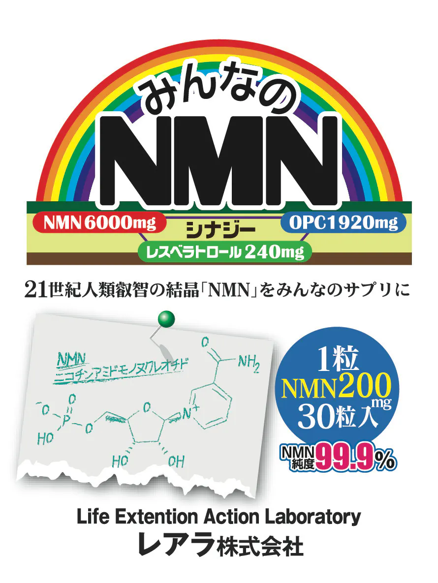 レアラ株式会社 「みんなのNMN」の情熱専門店 みなさまの未来へ続く素晴らしい毎日をサポートできたら嬉しいです [『みんなのNMN』は商標登録されています] NMN6000㎎ レスベラトロール240㎎ OPC1920㎎ シナジー 若々しさやコンディション維持、機能の安定化など、抗加齢のための原料を厳選した「みんなのNMN」をお届けいたします 加齢と共に体内量が減少し、食品には微量しか含まれず食事では必要量を摂取するのが難しいNMN、加齢と共に補うことがキーポイントとなります。 また、レスベラトロールとOPCを含むフランスの赤ワインエキスを配合し未来へ続く若々しさのために、栄養補完のコラボを実現します。 是非ご活用ください!