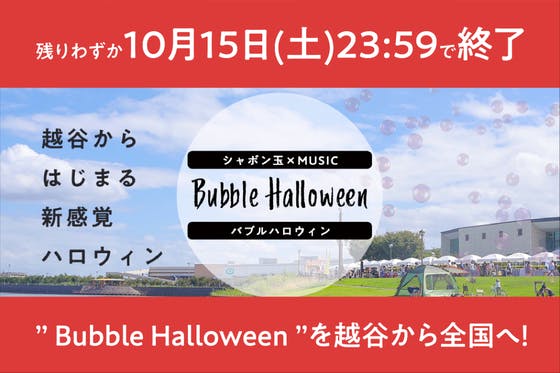 水辺に癒される「越谷レイクタウン 大相模調節池」で、大人も子供もはしゃげる新感覚のハロウィンイベントを開催するプロジェクト!シャボン玉と心地よい音楽が会場を癒し...