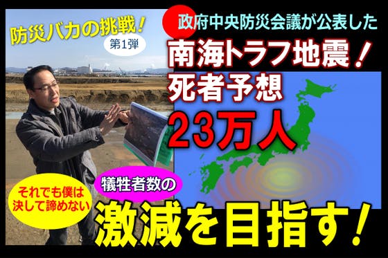 政府中央防災会議(会長・安倍首相)が公表した南海トラフ地震の死者予想23万人を激減させる為に挑戦⇒①1000年周期の震災が切迫している事実をチラシ印刷して、東南...