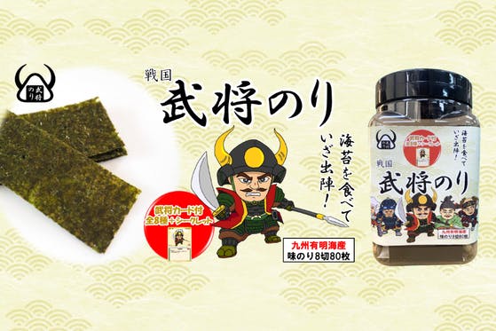 戦国武将と海苔がコラボした味のり「武将のり」を販売中です。「のり」にちなんだ武将のカード1枚がおまけ付き。武将は全8種+シークレット。