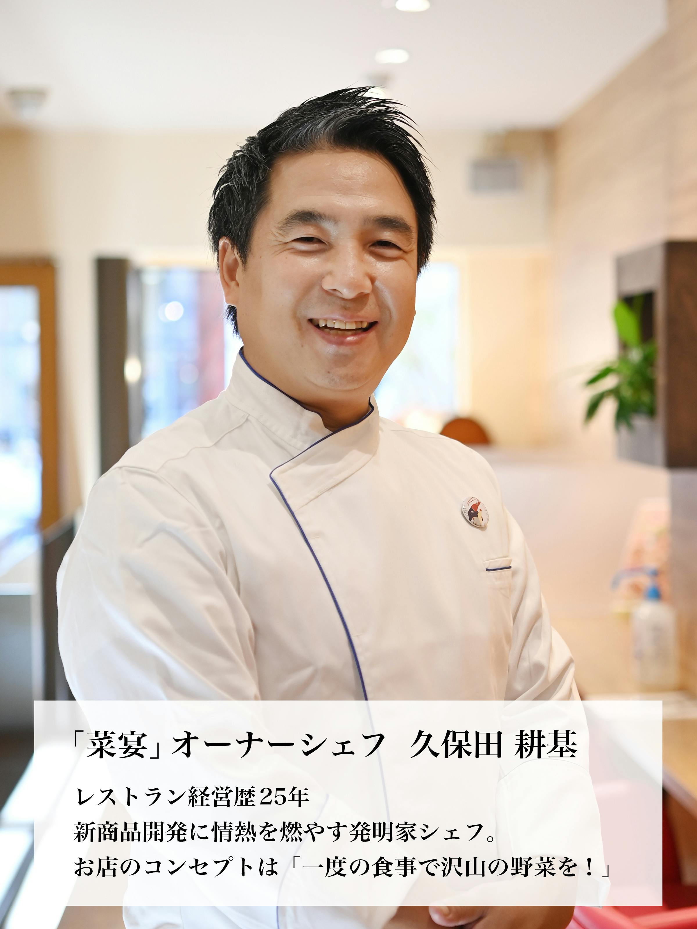 新商品開発に情熱を燃やす発明家シェフ久保田耕基 1978年1月、奈良県出身。フランス料理店に就職し、本場に行きたいという思いが強くなる。フランスのアルザスから来ていた友人の実家が料理店経営と知り、紹介してもらい、渡仏。21才の頃、本場の料理に触れる。帰国後、知人の声掛けで、奈良駅近くのホテルでビュッフェ形式の【らんぷり~る】をオープン。多くの方に楽しんでもらえたが、もっとひとりひとりと触れ合いができるお店にしたいと、今の【菜宴】をオープンする。レストランを開店し25年目。