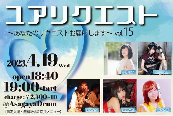 4月19日(水)開催のライブ「ユアリクエスト Vol.15」!出演アーティストへのリクエスト曲を募集いたします!会場で観覧の方も、配信をおうちで鑑賞の方も「あの...
