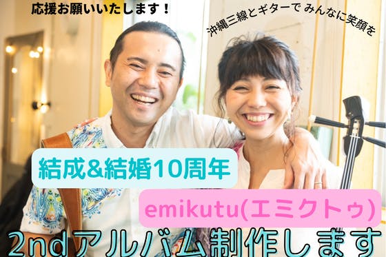 夫婦二人三脚で10周年。応援をしてくれてる皆さんへ、感謝の一枚を!CDアルバムを作りたい。ギターと三線の沖縄ポップス「emikutu(エミクトゥ)」多くの方に聴...
