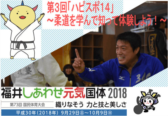 2018年、福井県で50年ぶりに開催される「第73回国民体育大会(福井しあわせ元気国体)」。第3回「ハピスポ14」を開催し、「柔道」を知らない子供たちに「柔道」...