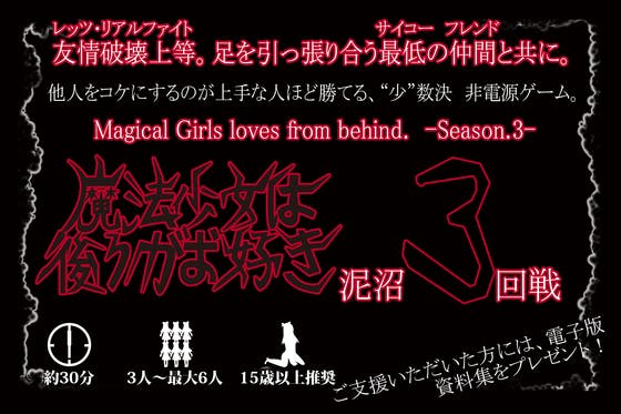 友情破壊上等なボドゲを専門で制作するサークル「しめりけ」の代表(ていうか個人サークル主)です。代表作は「魔法少女は後ろがお好き」。その代表作再販のためのクラウドファウンディングを再始動中!現在2万集金中、10/31まで。作者個人の趣味全開垢は@darkjun_ichi。