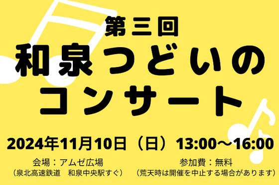 今年の11月10日に、大阪府和泉市のアムゼ広場にて、地域の方対象に無料コンサートを行います。 事前にボランティアセンターや社会福祉協議会で曲目のアンケートをと...
