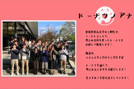 愛媛県の松山大学の学生が、地元の食材を使用したドーナツを大学祭で販売し、売り上げ上位2つを移動販売します!2020年2・3月限定で「動くドーナツ屋さん」をコンセ...