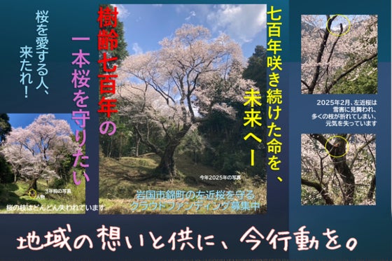 山口県岩国市向畑にある樹齢700年の一本桜「左近桜」を未来に残すため、雪害で傷んだ桜の保全活動に取り組むプロジェクトです。クラウドファンディングで支援を募ります。