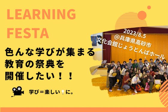兵庫県高砂市にて学生団体ONEDIVE主催の教育の祭典 LEARNING FESTAを開催いたします!! 多方面の教育のプロのトークライブ、教育観を考えるワーク...