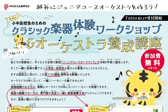 埼玉県越谷市に小学生~高校生までを対象としたジュニアユースオーケストラを、令和5年春に設立するべく活動を始めています。未来を担う子ども達が、仲間との関係を築きな...
