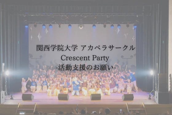 関西学院大学アカペラサークルCrescent Partyでは8月にサマーライブの開催を予定しておりますが、昨今のコロナ禍により運営する資金が不足しております。ラ...
