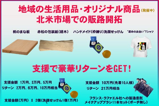 地域中小企業はアジア域には販路展開していますが、北米は敷居が高く躊躇しているようです。私たち、北米、欧州域の駐在員経験者たちは、海外での生活経験から、日本の伝統的な生活用品やアイデア商品が欧米に居住する方々に新たな生活のアイデアを提供できると確信し、日本の地域の生活用品を発掘する動きを始めました。まだ、数商品ですが、更に発掘していきたいと思います。支援者には、自分のゆかりのある地域での生活用品、オリジナル商品の推薦、紹介をお願いしたい。
