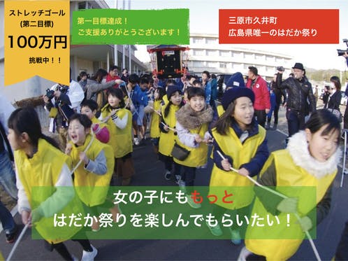 三原市久井町で101年続く広島県唯一のはだか祭りを継続させるために、参加する女の子が祭りをより楽しんでもらえるようにハッピを作りたいです!