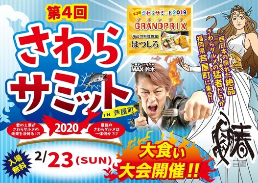 さわらを使ったグルメバトルイベント「さわらサミット2020in芦屋町」を開催いたします。今年度はさわらサミットが盛り上がるよう、大食い大会を実施いたします。皆様...