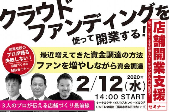 2020年2月12日(水)店舗開業支援セミナーを開催。テーマはクラウドファンディングを使って開業する!店舗開発のプロ、資金調達のプロ、クラウドファンディングのプ...