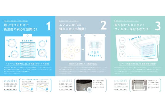 世界に先駆けて最も薄くした空気清浄機能を持った清浄ユニットです。 お使いのエアコンに取り付け、空気を吸い込む力を利用して空気をキレイにする衛生フィルターです。...