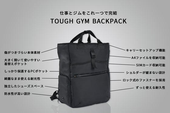 長年使える高耐久素材とミニマルなデザインが魅力の「TOUGH GYM BACKPACK」。ビジネスシーンにも馴染むスタイリッシュな外観に、ジム対応の収納機能をプ...