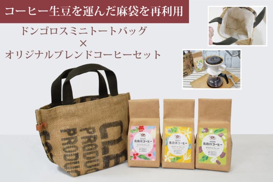 コーヒー生豆を運んだ麻袋を再利用したドンゴロスミニトートバッグとオリジナルブレンドコーヒーのセット商品です。焙煎後に生まれる、麻袋をトートバッグとして再利用いた...