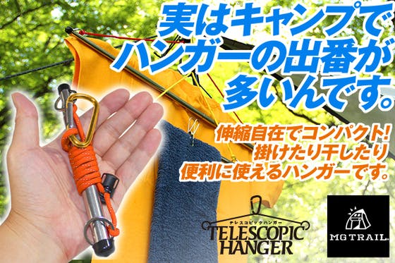 実はキャンプでハンガーの出番が多いんです。伸縮してコンパクトに持ち運べるハンガーはかなり便利!上着を掛けたりシュラフを干したりタオルを掛けたり、さら火吹き棒にも...