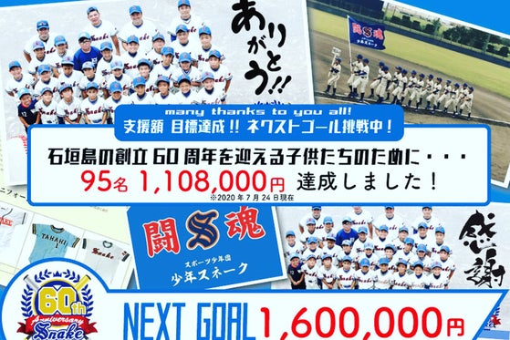 創立60周年を迎えた石垣島の少年野球チーム【少年スネーク】です。新型コロナで、記念式典や祝賀会の予定も中止になり…更に、記念冊子や記念品作成に充てるはずの資金造...