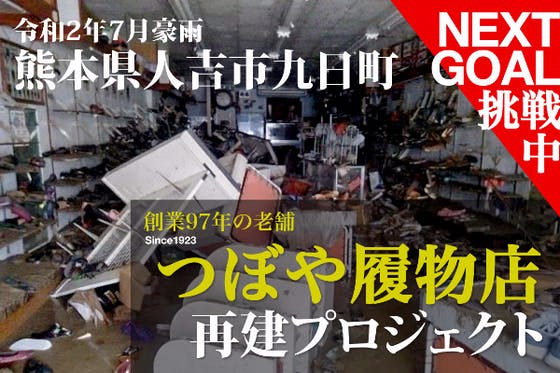 人吉市九日町、創業97年の老舗『つぼや履物店』が令和2年7月豪雨による洪水で建物の二階まで浸水。壊滅的な状況になってしまいました。再建の為のプロジェクトです。