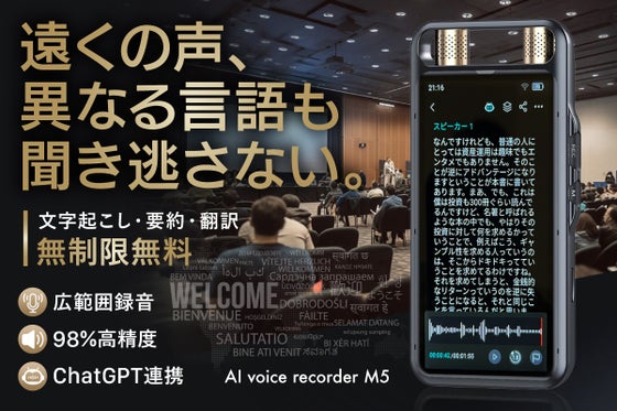 15m先の音声を拾える高性能マイク搭載のボイスレコーダー。AIで音声をテキスト化&議事録作成が可能で、指定言語で自動文字起こし。要約機能により議事録が自動で完成...