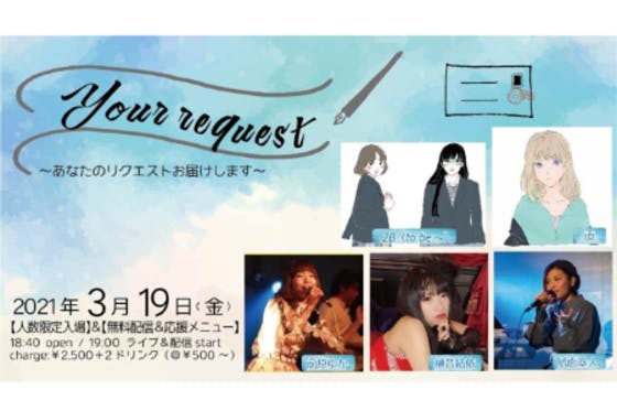 3月19日(金)開催のライブ「ユアリクエスト Vol.1」出演アーティストへのリクエスト曲を募集いたします!会場で観覧の方も、配信をおうちで鑑賞の方も、「あの曲...