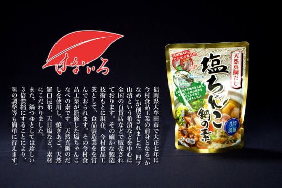 今村食品工業が監修した、「塩ちゃんこ鍋の素」は、天然真鯛、焼きあご、羅臼昆布、天日塩など、素材を厳選し作り上げております。また、3倍濃縮のため途中で味が薄まって...
