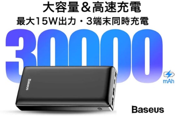 大容量30,000mAh・最大15W出力のモバイルバッテリー「BaseusPowerBankMini」高コスパ&高スペック!3端末同時充電。急速充電対応。これ一...